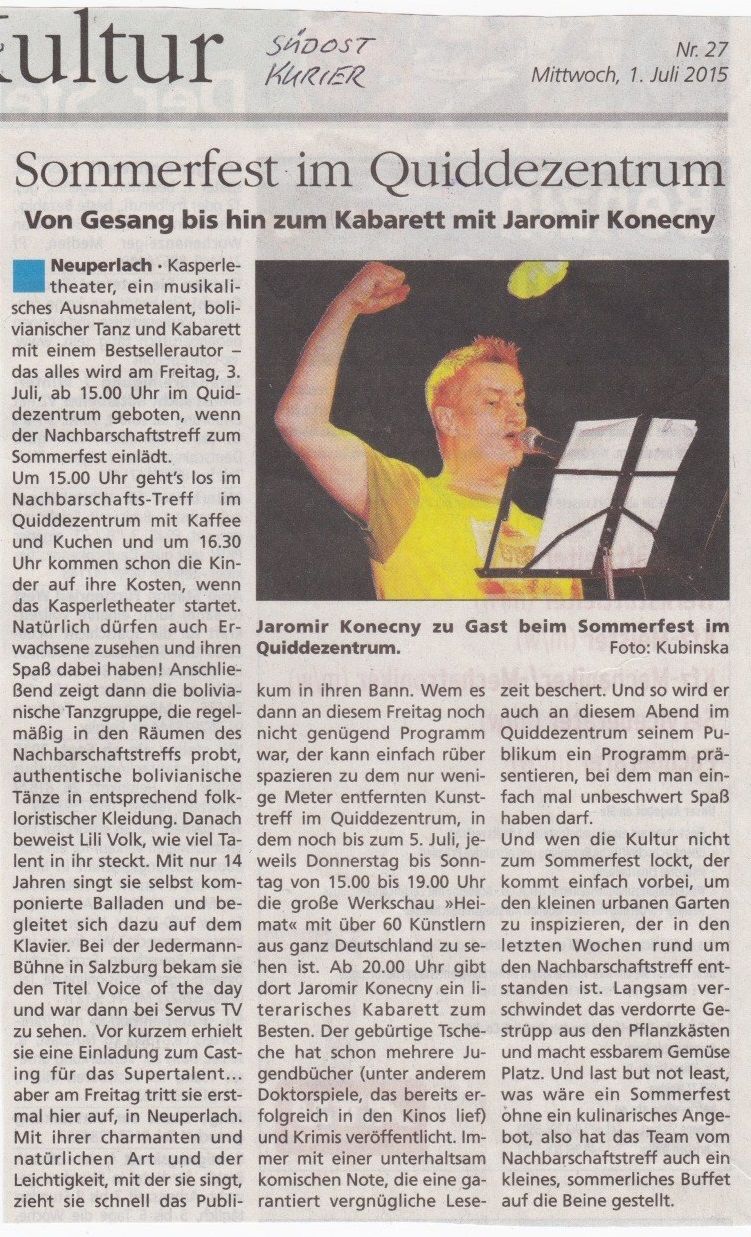 Zeitgleich zur Ausstellung, die Donnerstag bis Sonntag von 15 – 19 Uhr zu sehen ist, gibt es verschiedene Abendveranstaltungen, die aufzeigen, wie viele Facetten dieses Thema hat. Gleich zur Eröffnung am Donnerstag den 25.06. um 19.30 gibt es eine Podiumsdiskussion unter dem Motto „Wieviel Heimat brauchen wir?“ unter der Moderation von Christl Riemer-Metzger, die den Nachbarschaftstreff Quiddezentrum mit ins Leben gerufen hat. Am Freitag, den 26.06. findet um 18.30 Uhr eine kleine Lesung mit dem Text „Jetzt“ von Sigrun Peller statt, eine Erzählung, die Heimat in Kindheitserinnerungen verortet. Unter der Moderation von Kiomars Abedini steht der Samstag ab 18 Uhr im Zeichen von internationalen Tänzen: Vom Balkan über Griechenland bis nach Israel und ein kleiner Hauch von Orient. Vorführungen und Mitmach-Aktionen (keine tänzerischen Vorkenntnisse erforderlich!) wechseln sich ab und alle Besucher und Beteiligte des Abends sind dazu eingeladen, Spezialitäten aus ihren „Heimatländern“ mitzubringen. Am darauffolgenden Wochenende gibt es am Freitag, den 03.07. ab 20 Uhr literarisches Kabarett mit Jaromir Konecny. Er ist gebürtiger Tscheche, war Techniker in Lybien, Schiffsmeister bei der Elbe-Oder-Schifffahrt, emigrierte nach Deutschland (lebte viele Jahre sogar mitten in Neuperlach!), promovierte in Chemie und ist heute erfolgreicher Autor und Kabarettist. Von seinen Büchern wurde das Jugendbuch »Doktorspiele« bereits verfilmt und lief letztes Jahr erfolgreich in den Kinos. Er erhielt verschiedene Literaturpreise, nicht zu vergessen die über 60 gewonnenen Poetry Slams. Bei den Schwabinger Schaumschlägern und bei seinen anderen Auftritten stellt er immer wieder unter Beweis, dass er nicht nur irrwitzig komische Szenen schreiben kann, sondern damit auch live auf der Bühne sein Publikum begeistert. Mit einer guten Portion Selbstironie lässt er skurrile Geschichten entstehen oder thematisiert den alltäglichen Wahnsinn, der kaum zu meistern wäre, wenn man nicht auch eine humoristische Seite daran entdecken könnte.